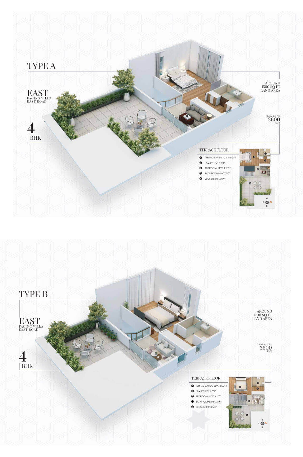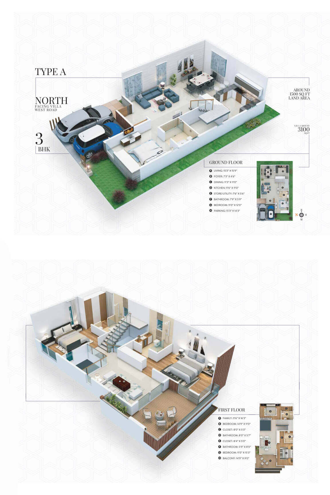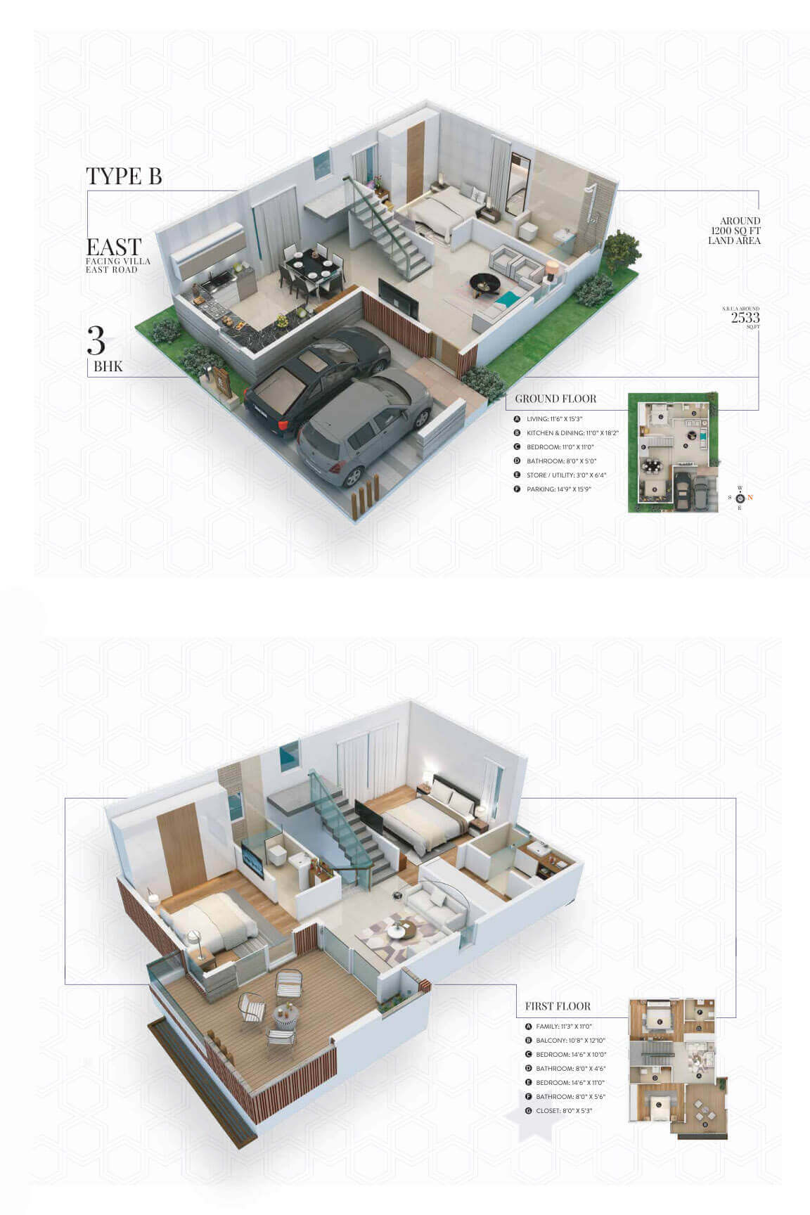 In all, this premium residential destination will host super luxury villas that span across two categories of land area around 1500 Sqft(Type A) and 1200 Sqft (Type B) with SBUA ranging from 2533 Sqft to 3767 Sqft varied for 3 & 4BHK villas accompanied by a variety of luxury amenities for signature living. Each villa at Daiwik Sapphire is designed to outclass your imagination of a villa that complements your lifestyle.
